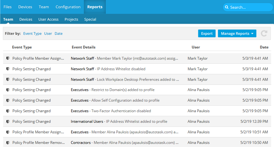 - Click Team, User Access, Devices, or Projects to select your report type.
