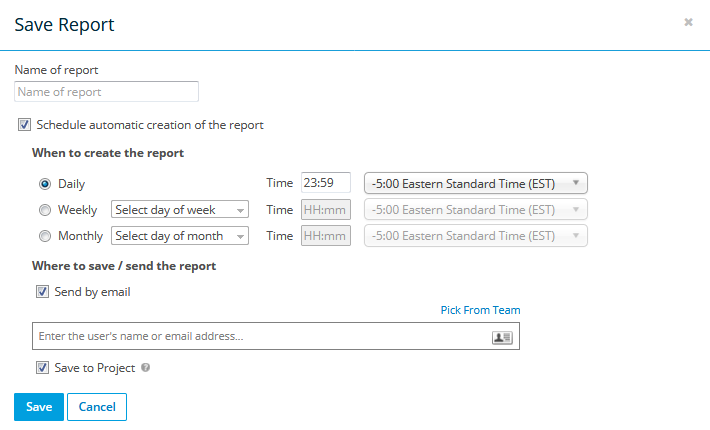 You may select anyone on your team as a recipient. When the scheduled report is generated, it will be emailed to the recipients listed here. Save to project
