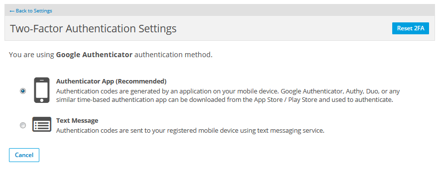 - Click the Reset 2FA button.