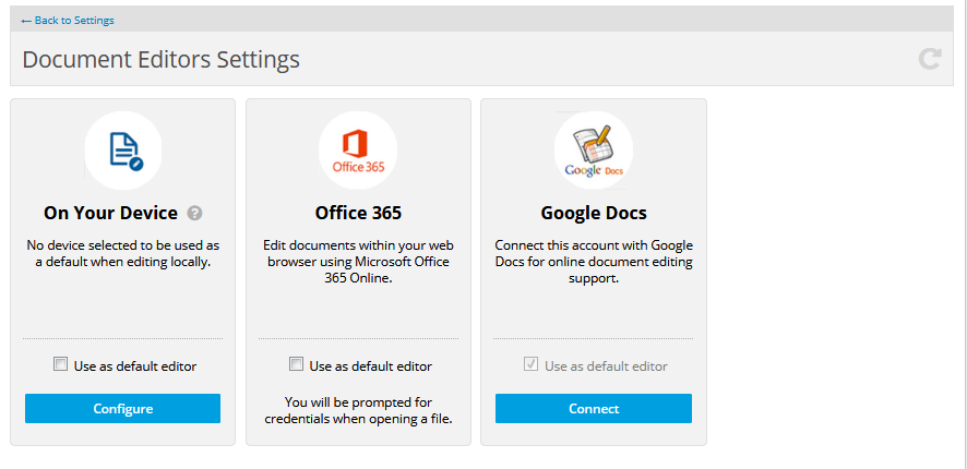To optionally set a document editor or your local machine as the default document editor, select the Use as default editor check box for the corresponding editor.