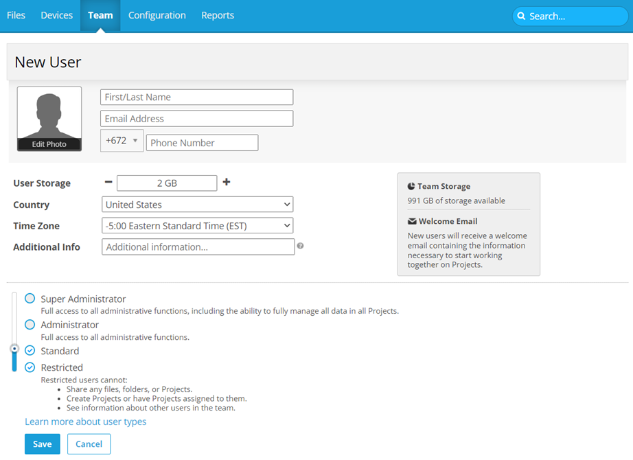 You'll use this view to add users to your team one at a time. If you want to add several users at once, refer to Import users.