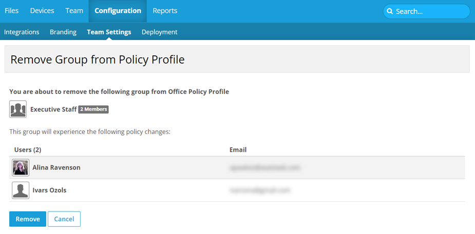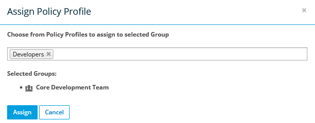 NOTE This view will list the policy profiles currently assigned to the group, as well as a list of all individual policies for any profiles that have been assigned to the group. The first column has a dropdown, which allows you to select from the policies assigned. The second column shows the policies that are actually applied. Use this list to review the currently applied policies before proceeding.