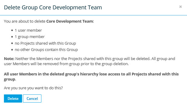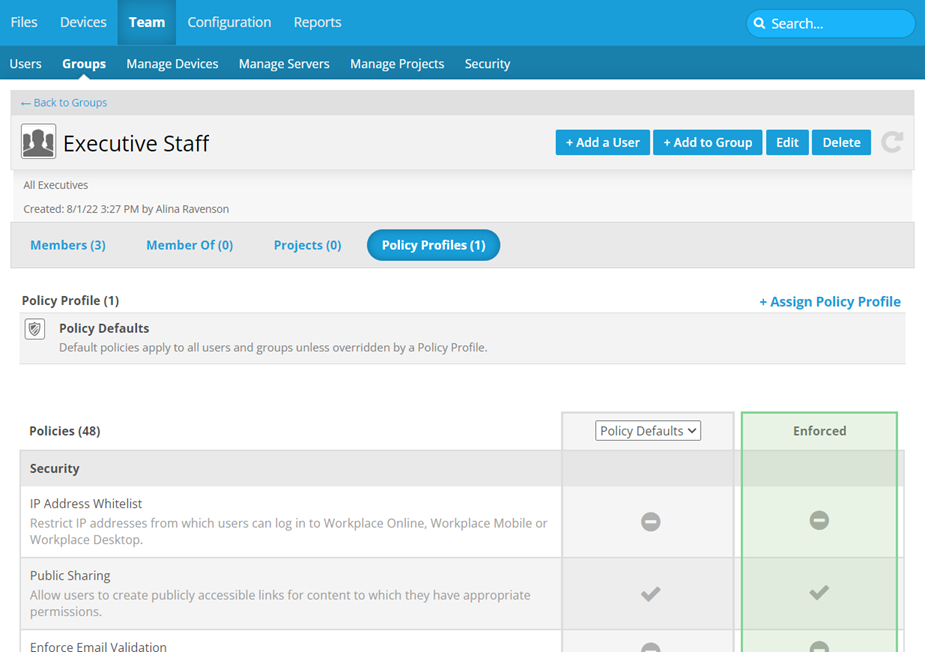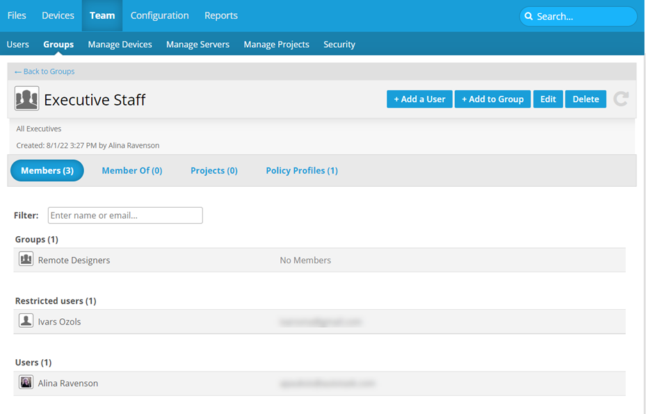 The list in the lower portion of the page displays the group's members, the projects the groups is working on, and the policy profiles assigned to the group.