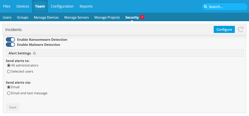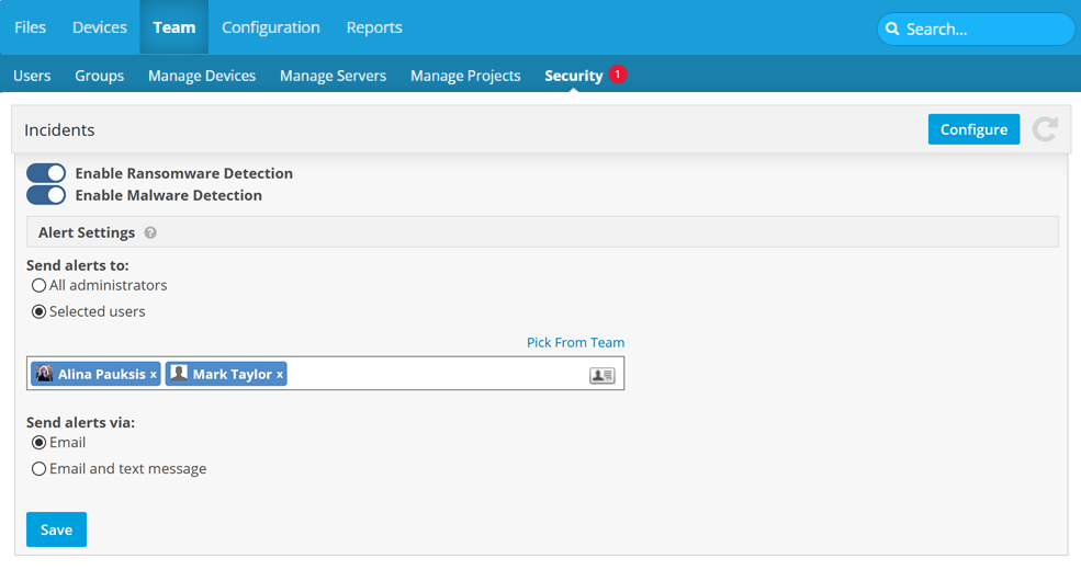 - Automatically notifies all team administrators and Super Administrators of security incidents by default.