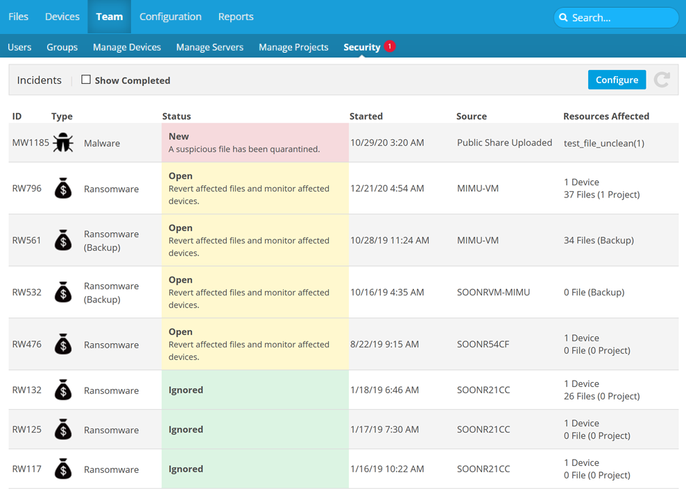 - Provides you with a mechanism to ignore a ransomware incident reports from certain devices, or to place one or more devices on a Security Excluded Devices list to avoid repeated false positive incident reports.