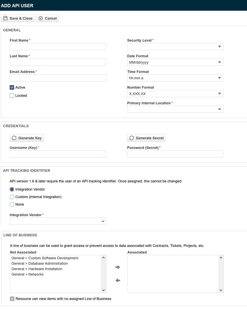 NOTE To facilitate seamless synchronization of services through the integration, we recommend using the API User (System) security level.