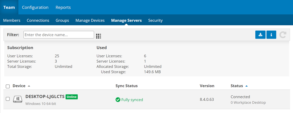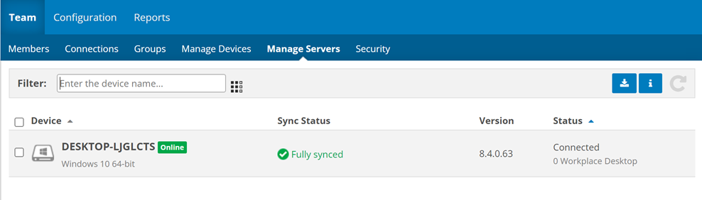 | Device | Summary information about the server, including the name of the device, status (Online, Offline, Disabled, or Recycled), the operating system, and if applicable, additional status-related information (e.g. if the status is Recycled, this column will display the number of days before it will be permanently removed. This column cannot be hidden. |