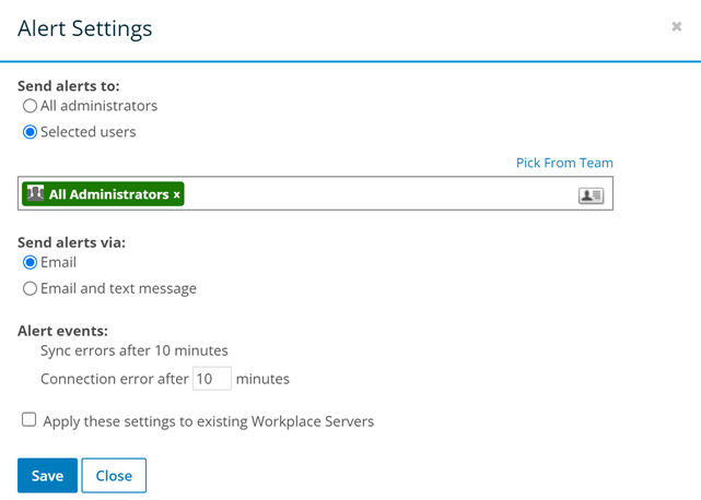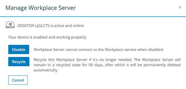 IMPORTANT Disabled Workplace servers cannot connect to the service until enabled again.
