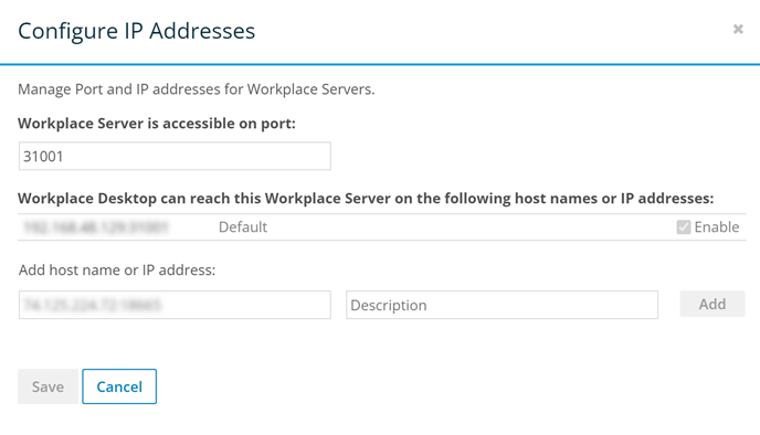 | Workplace Desktop can reach this Workplace Server on the following host names or IP addresses: | This area lists all the host names and IP addresses at which Workplace Desktop can reach this Workplace server. To enable or disable the first host name or IP address, select or clear the Enable check box. You cannot disable this item if there are no secondary host names or IP addresses. To remove an item, click the X icon associated with it. You cannot delete the first host name or IP address. |