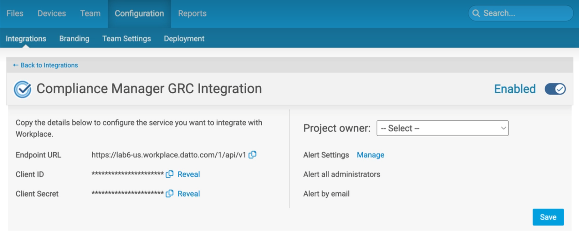 NOTE  The Workplace project used for the integration must have an owner. If you're using a metered Workplace plan, the storage used by the integration files will come from the project owner's storage allocation.